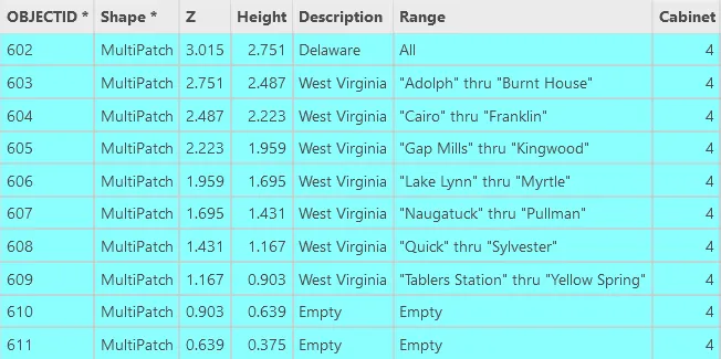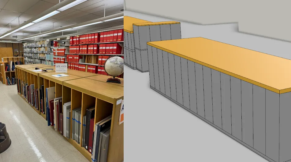 To further enhance the user experience, the team sought to leverage existing GIS technologies to create an accurate and realistic 3D model of the indoor environment containing the maps and atlases, specifically storage cabinets, bookshelves, walls, and columns. This would be created in such a way that each individual smallest storage space (e.g., drawer) would have a row in the table with its respective attributes (map category and subcategory, geographic subject, cabinet number), allowing the table to be queried to find items of interest. Eventually, this model would be embedded into a web application that the general public could access and use to explore the map collection from anywhere and anytime.